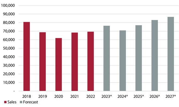 Broad-based growth in equipment sales is expected to resume this year, with the market forecast to rise 10 per cent. This will be driven by a range of infrastructure investment plans. With a general election due in 2024, this year’s budget has a particularly strong emphasis on investment as Prime Minister Modi seeks a third term in office.